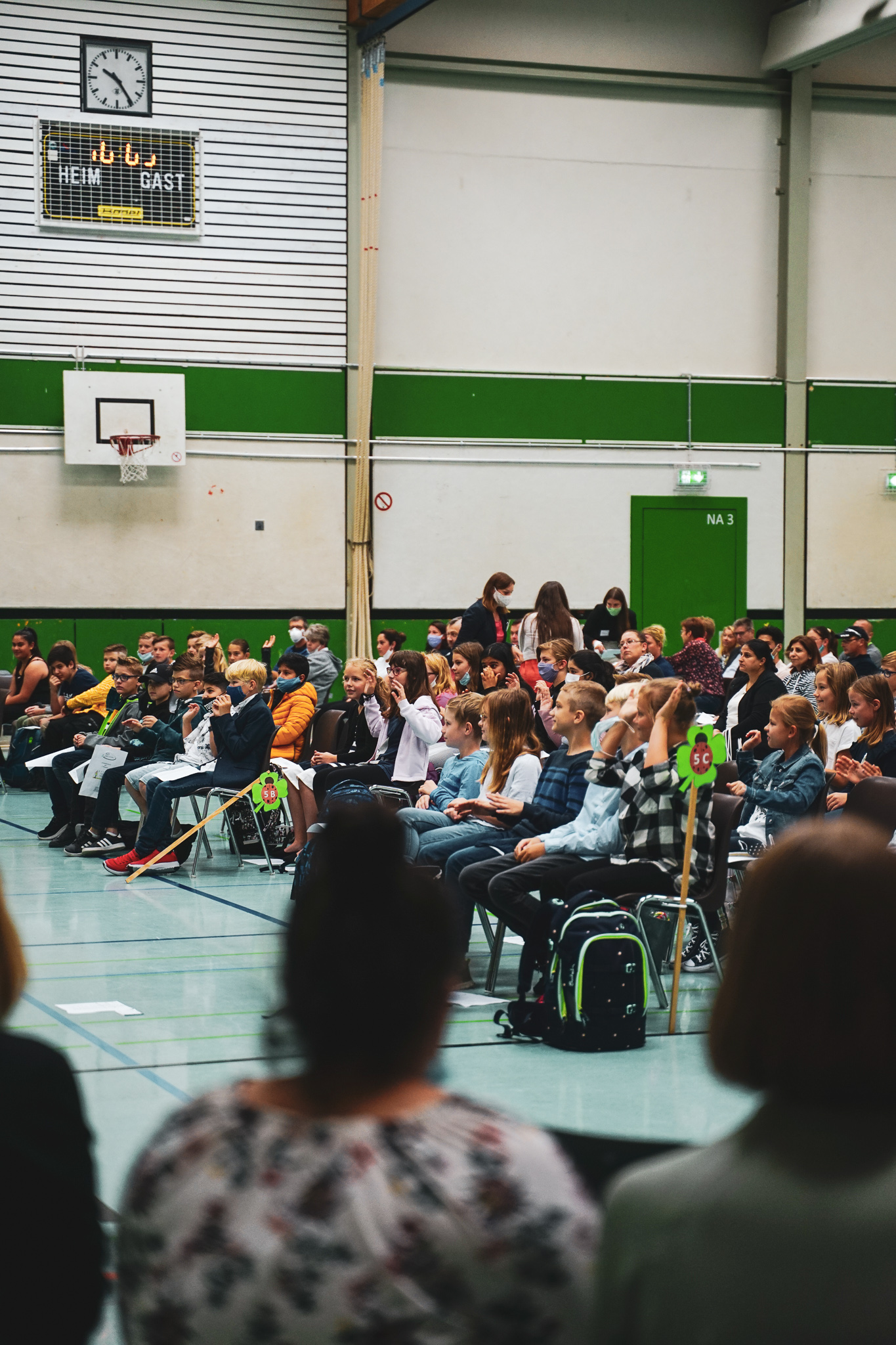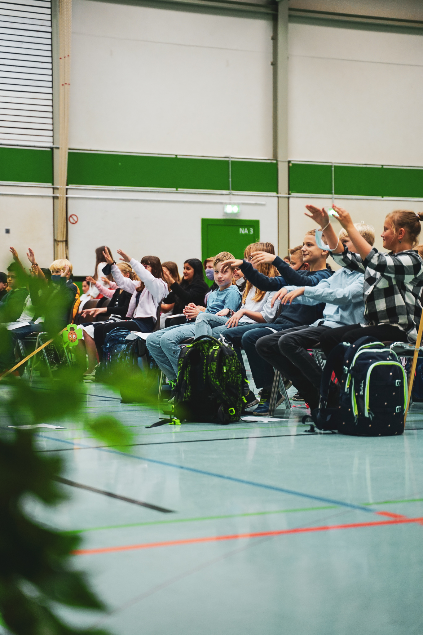 Neben zukunftsweisenden, zugewandten Worten des Schulleiters Dr. Marco Schinze-Gerber sowie des Bürgermeisters Axel Düker (vgl. Pressemitteilung), wurden die Schülerinnen und Schüler während des Beitrages „Are you ready?“ über eine Bodypercussion zum Mitmachen angeregt und auf ihre Einführungswoche eingestimmt. An dieser Stelle beteiligten sich sogar Erziehungsberechtigte und Lehrkräfte der Schule. Hervorragend. Wir sind bereit.