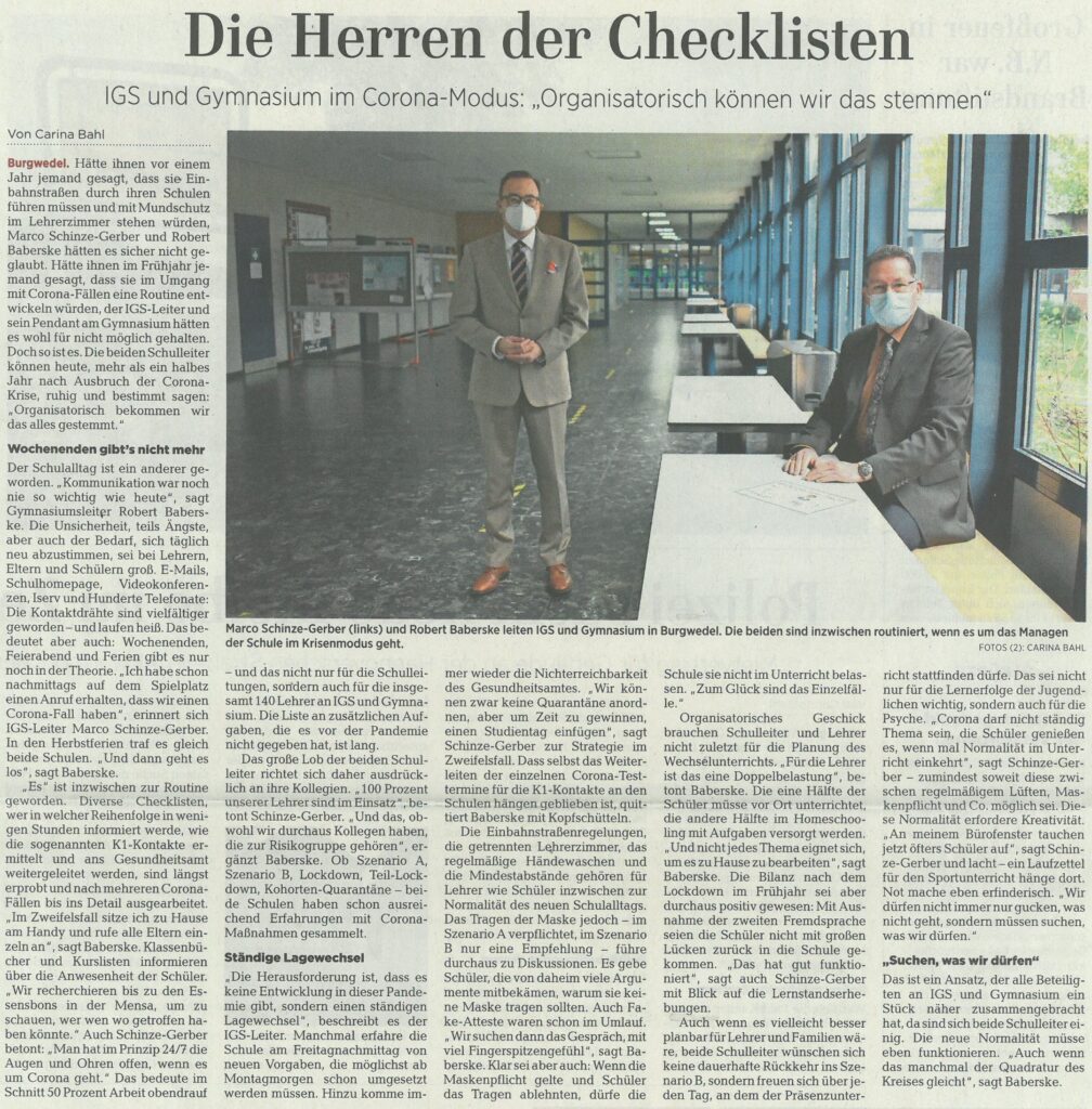 Presse: Die Herren der Checklisten HAZ, 18.11.2020 IGSBurgwedel 18. November 2020 Allgemein Weiterlesen Vorheriger BeitragPresse: Lehrer der IGS bekommen Tablets für den UnterrichtNächster BeitragPresse: „Abschlussklassen der Oberschule werden im Wechselmodell unterrichtet“ Das könnte dir auch gefallen Neue Fußbälle für den Sportunterricht 14. Oktober 2022 Entdeckernachmittag an der IGS Burgwedel beim Tag der offenen Tür 9. März 2024 Besuch der Klasse 7c bei WOK – World of Kitchen 14. August 2024