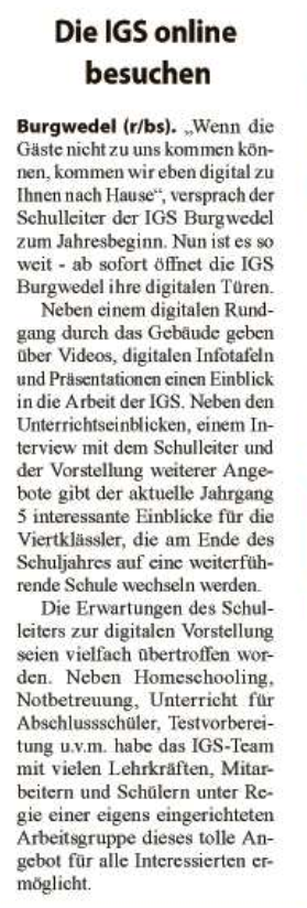 Unser erster Tag der offenen Tür lief erfolgreich. Über unsere Homepage konnten Interessierte die IGS Burgwedel durch kleine Beiträge von Schüler*innen und Lehrer*innen besser kennen lernen. Die Burgwedeler Nachrichten berichteten darüber.