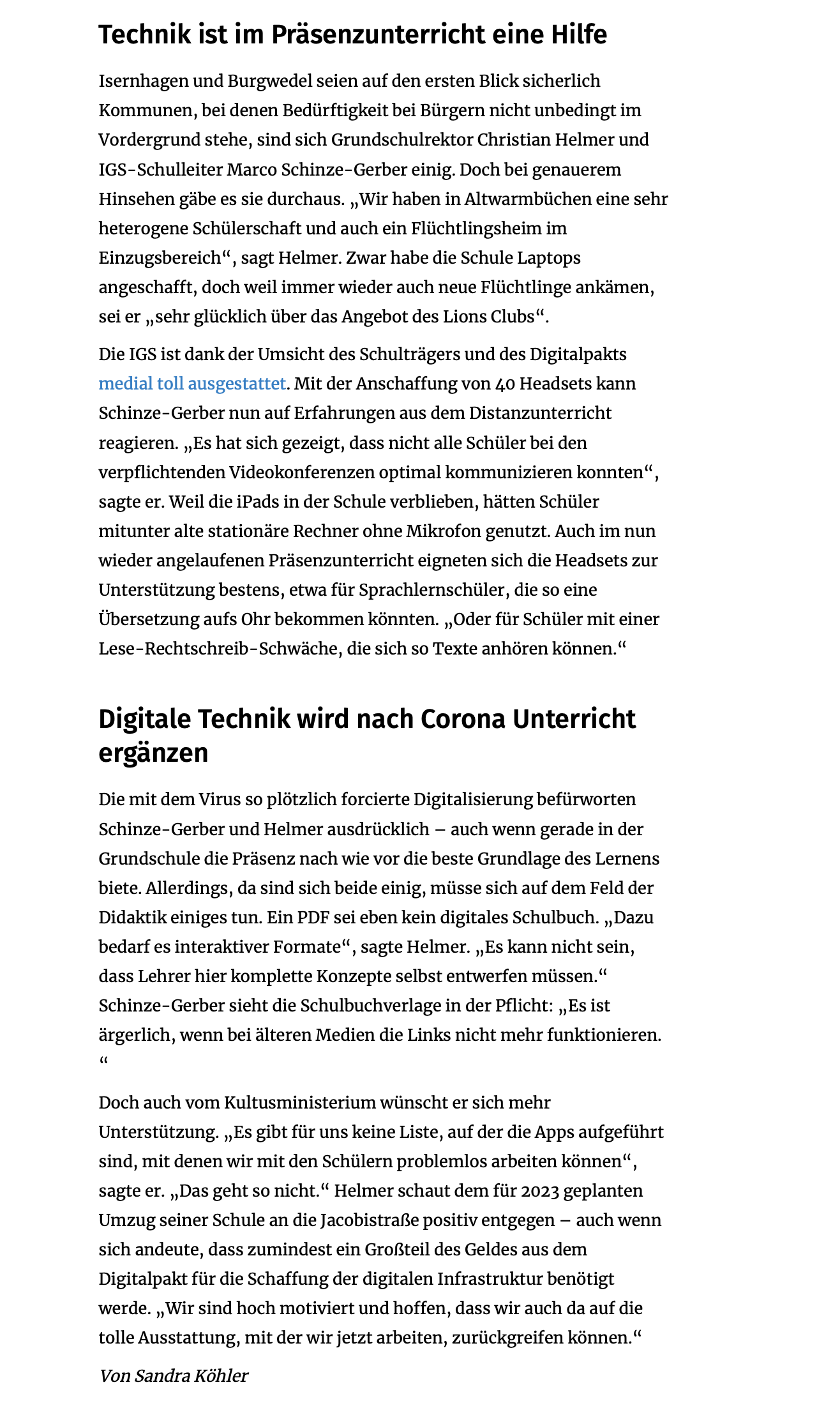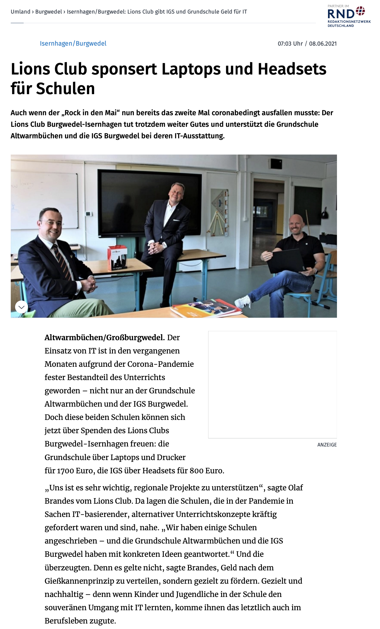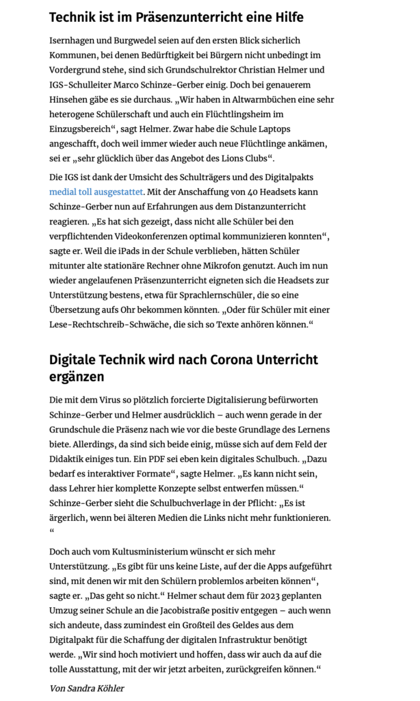 Die IGS Burgwedel sowie die Grundschule Altwarmbüchen erhielten Laptops und Headsets durch eine Spendenaktion des Lionsclub Burgwedel-Isernhagen. Dazu erschienen Artikel in der HAZ und im Marktspiegel.