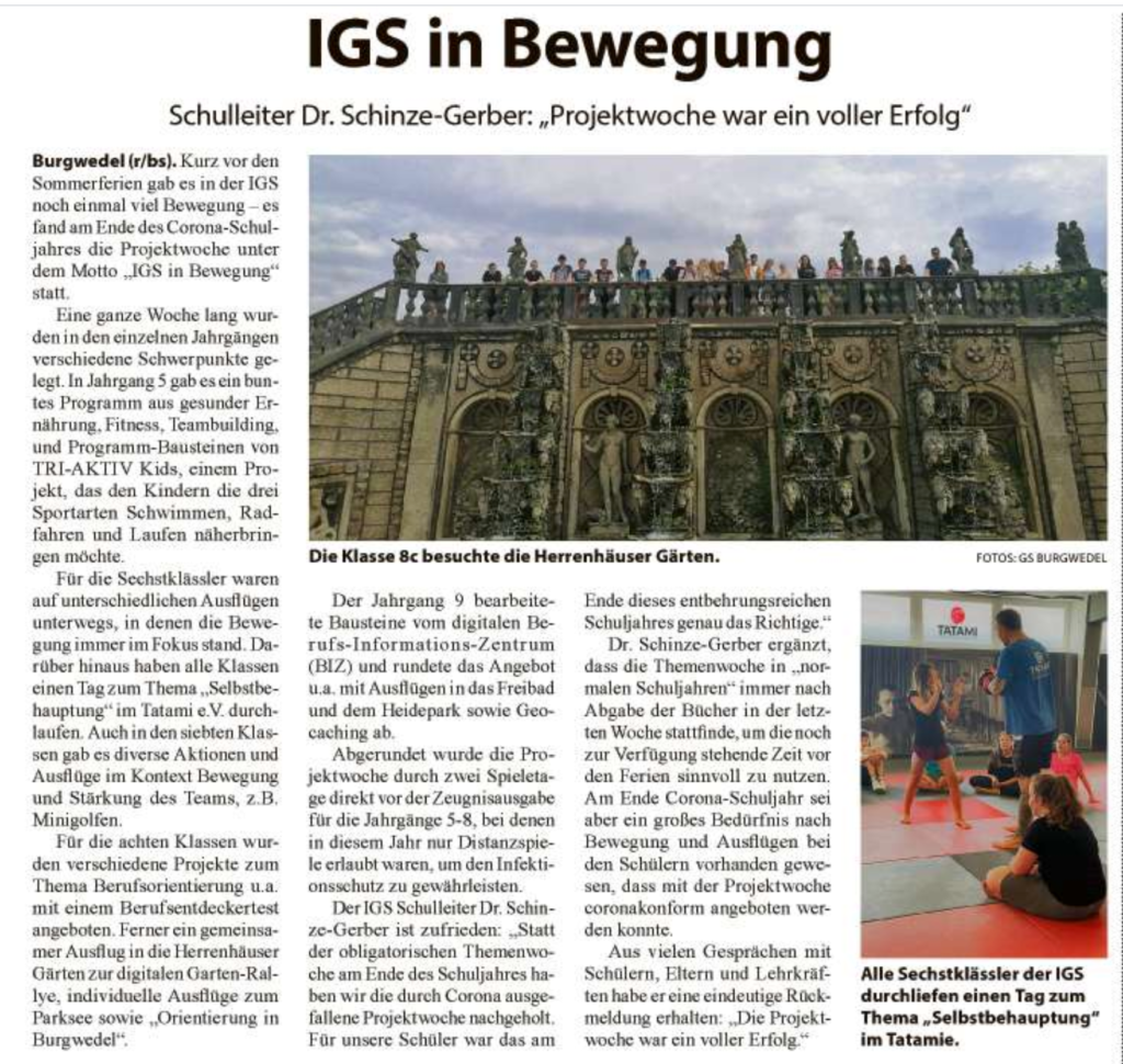 IGS in Bewegung – Marktspiegel berichtet über die Projektwoche vor Beginn der Sommerferien Marktspiegel - 31.07.21 IGSBurgwedel 31. Juli 2021 Allgemein Weiterlesen Vorheriger BeitragDas Projekt „Rettungsring“ – HAZ berichtetNächster BeitragSchuljahr beginnt für IGS-Schüler mit Präsenzunterricht – HAZ berichtet Das könnte dir auch gefallen Müllsammelaktion an der IGS Burgwedel – Marktspiegel berichtet 23. März 2023 Exkursion zur Freiherr von Boeselager-Kaserne nach Munster 15. September 2022 Presse: „Abschlussklassen der Oberschule werden im Wechselmodell unterrichtet“ 13. Januar 2021