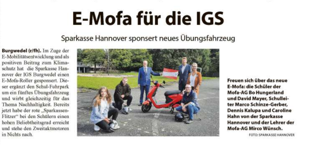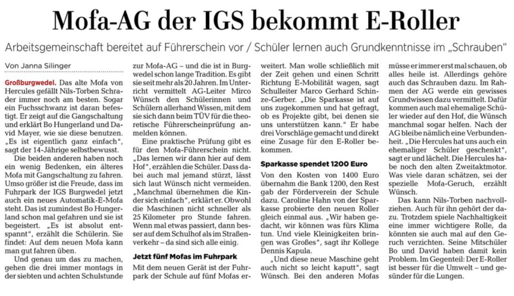 Mofa-AG der IGS bekommt E-Roller – HAZ und Marktspiegel berichten HAZ - 29.09.21 Marktspiegel - 04.10.21 IGSBurgwedel 4. Oktober 2021 Allgemein Weiterlesen Vorheriger BeitragAchtung! Die dunkle Jahreszeit steht bevor – Macht eure Fahrräder sicher!Nächster BeitragAusbildungsmesse „Startklar“ an der IGS Burgwedel – HAZ berichtet Das könnte dir auch gefallen Die Oberschule feiert ihren letzten Jahrgang – HAZ berichtet 3. Juli 2021 IGS in Bewegung – Marktspiegel berichtet über die Projektwoche vor Beginn der Sommerferien 31. Juli 2021 Solidarität mit Ukraine: Schulen bilden Peace-Zeichen – HAZ berichtet 25. März 2022