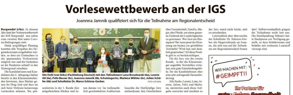 In diesem Jahr fand der Vorlesewettbewerb der IGS Burgwedel nun schon zum zweiten Mal unter Corona-Bedingungen statt. Dank sorgfältiger Planung konnten alle Vorgaben des Hygienekonzepts eingehalten werden, so dass ein Eintauchen in die spannenden Vorlesetexte möglich war und die Gedanken an die Pandemie schnell in den Hintergrund rutschten.