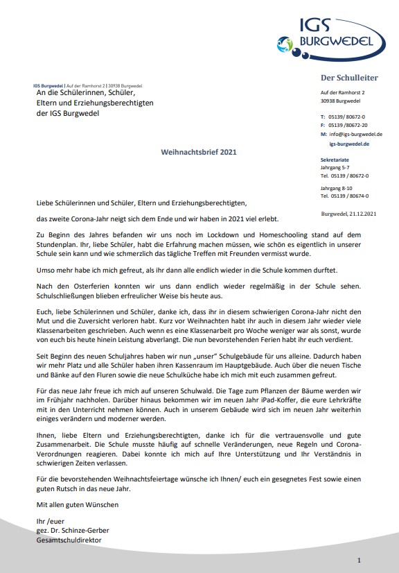 Quelle: Pixabay Weihnachtsbotschaft 2021 Im Folgenden finden Sie/ findet ihr die Weihnachtsbotschaft unseres Schulleiters Dr. Schinze-Gerber in verschiedenen Versionen. Frohe Weihnachten und erholsame Ferien! Als HD-Video: Als Kompakt-Video: Als Brief: IGSBurgwedel 21. Dezember 2021 Allgemein Weiterlesen Vorheriger BeitragJoanna Jamnik gewinnt den Vorlesewettbewerb der IGS Burgwedel – Marktspiegel und Burgwedel Aktuell berichtenNächster BeitragStrenge Maskenpflicht und gute Impfquote: Schulstart am Montag – HAZ berichtet Das könnte dir auch gefallen Auf Entdeckungsreise in Paris 25. September 2023 IGS Burgwedel feiert Bildungshattrick: Drei Auszeichnungen für eine starke Schulgemeinschaft 1. Juni 2025 Teilnahme am Englischwettbewerb „The Big Challenge“ 7. August 2024