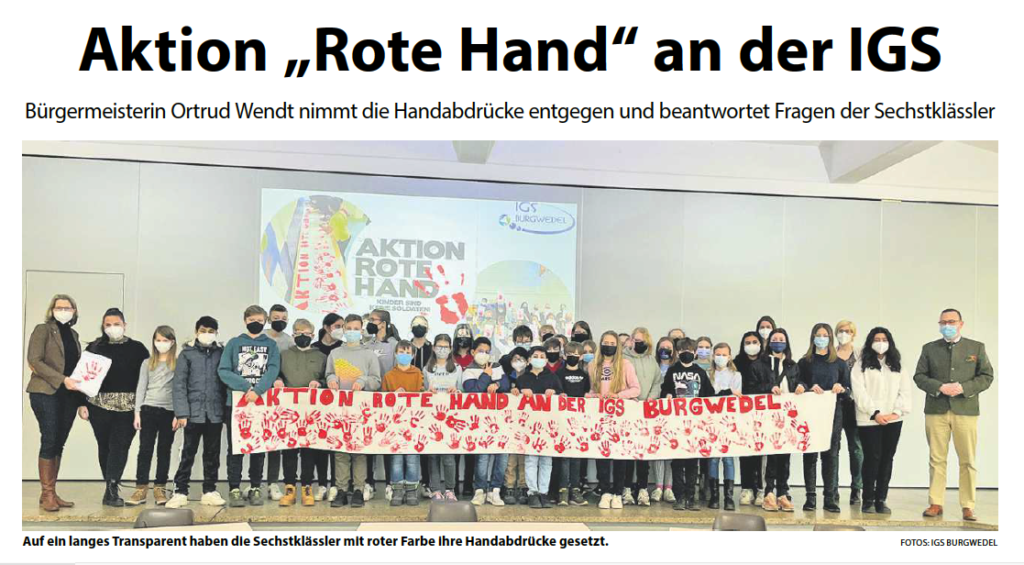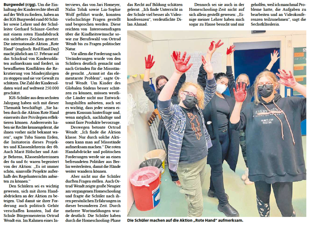 Aktion „Rote Hand“ an der IGS Burgwedel – Marktspiegel, HAZ und Burgwedel Aktuell berichten Marktspiegel - 20.02.22 HAZ - 16.02.22 Burgwedel Aktuell - 11.02.22 IGSBurgwedel 16. Februar 2022 Allgemein Weiterlesen Vorheriger Beitrag„Blumen sind die Liebesgedanken der Natur“ (Bettina von Arnim) – Verkaufsaktion zum Valentinstag der Schülerfirma „swInGS“Nächster BeitragUnser Schulwald soll entstehen – Informationen für Eltern und Erziehungsberechtigte Das könnte dir auch gefallen Ministerbriefe – Informationen zu den Weihnachtsferien 10. Dezember 2021 Deutsch-Französischer Tag in der 1. großen Pause gefeiert – HAZ und Burgwedeler Nachrichten berichten 29. Januar 2022 Schulhunde erneut im Radio – FFN berichtet über unsere Schulhunde 1. Dezember 2024