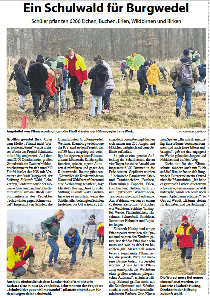 Aktion Schulwald – Schüler*innen pflanzen 6200 Bäume – RTL Nord, Marktspiegel, HAZ und Burgwedel Aktuell Marktspiegel - 13.03.22 HAZ - 08.03.22 Burgwedel Aktuell - 24.02.22 IGSBurgwedel 8. März 2022 Allgemein Weiterlesen Vorheriger BeitragFreiwilliges E-Mail-Austauschprojekt für die Klassen 9 und 10Nächster BeitragSpendenaufruf für die Opfer des Krieges in der Ukraine Das könnte dir auch gefallen Der 8. Jahrgang unterwegs im Handwerk- Ein kurzer Einblick in die Werkstatttage 20. Dezember 2023 Rossmann Robomania 4. September 2023 „Blumen sind die Liebesgedanken der Natur“ (Bettina von Arnim) – Verkaufsaktion zum Valentinstag der Schülerfirma „swInGS“ 14. Februar 2022