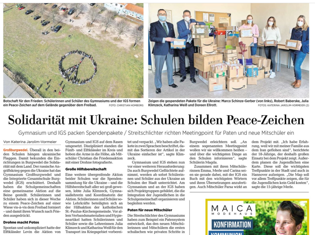 Solidarität mit Ukraine: Schulen bilden Peace-Zeichen – HAZ berichtet HAZ - 25.03.22 IGSBurgwedel 25. März 2022 Allgemein Weiterlesen Vorheriger BeitragTheateraufführung für den 5. JahrgangNächster BeitragSpenden sammeln mit UNICEF für Kinder in der Ukraine Das könnte dir auch gefallen Saubere Sache! Die Aktion „saubere Schule“ 28. Januar 2022 Sprayerausflug der 8a zur Glocksee 7. Oktober 2022 Kinder pflanzen 1680 Sträucher – HAZ und Marktspiegel berichten 23. November 2022