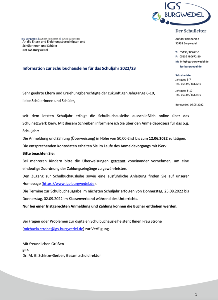Informationen zur Schulbuchausleihe für das kommende Schuljahr Anleitung Schulbuchausleihe Hier gelangen Sie/ gelangt ihr zu einer hilfreichen Anleitung zur digitalen Schulbuchausleihe. IGSBurgwedel 19. Mai 2022 Allgemein Weiterlesen Vorheriger BeitragAnmeldung von Schülerinnen und Schüler aus der UkraineNächster BeitragDie IGS Burgwedel nimmt am Schulsanitätsdienst-Wettbewerb teil Das könnte dir auch gefallen Die IGS Burgwedel setzt sich kreativ und vielseitig für die Zukunft ein 31. Juli 2024 Juniorwahl 2021 – Burgwedeler Nachrichten und AltkreisBlitz berichten 28. September 2021 Auf Entdeckungsreise in Paris 25. September 2023