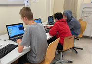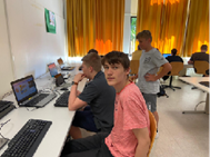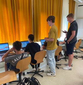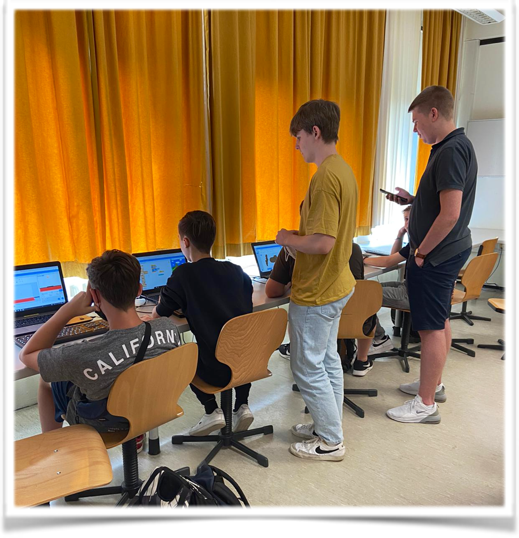Pünktlich zur ersten Stunde standen die Interessierten bereit und wurden zunächst in das Programm „Scratch“ eingewiesen. Dieses ermöglicht den Jugendlichen Zugriff auf eine visuelle Programmiersprache, mit welcher nicht nur Spiele, sondern auch Geschichten und Animationen kreiert werden können. Mit den Inspirern Sören und Jonas wurden die Grundlagen schülerfreundlich durch das Programmieren eines ersten Spiels vermittelt. Mit den Basics an der Hand durften die Schüler in einem nächsten Schritt ihrer Kreativität freien Lauf lassen und ein eigenes Spiel erstellen – zwischendurch durfte ein gegenseitiges Ausprobieren natürlich nicht fehlen.
