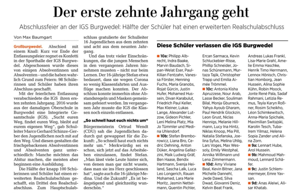 Abschluss 2022 – Der erste zehnte Jahrgang der IGS geht – HAZ und Markspiegel berichten Marktspiegel - 09.07.22 HAZ - 02.07.22 IGSBurgwedel 9. Juli 2022 Allgemein Weiterlesen Vorheriger BeitragGames Convention „light“ an der IGS BurgwedelNächster Beitrag„Notruf Miriam“ in der Projektwoche – HAZ berichtet Das könnte dir auch gefallen Jahrgang 6 besucht Vorstellung des White Horse Theaters 5. Februar 2025 Kochen als Unterrichtsfach – IGS Burgwedel bei logo! vom ZDF 6. Februar 2022 Die IGS Burgwedel setzt sich kreativ und vielseitig für die Zukunft ein 31. Juli 2024