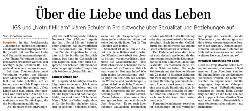 „Notruf Miriam“ in der Projektwoche – HAZ berichtet HAZ - 09.07.22 IGSBurgwedel 10. Juli 2022 Allgemein Weiterlesen Vorheriger BeitragAbschluss 2022 – Der erste zehnte Jahrgang der IGS geht – HAZ und Markspiegel berichtenNächster BeitragIGS Burgwedel erfolgreich beim Englischwettbewerb „The Big Challenge“ – HAZ berichtet Das könnte dir auch gefallen Peaches gewinnt den Vorlesewettbewerb 2023 13. Dezember 2023 IGS feiert den Deutsch-Französischen Tag der Freundschaft 16. Februar 2025 IGS nimmt neue Schulküche in Betrieb – HAZ und Burgwedeler Nachrichten berichten 6. Oktober 2021