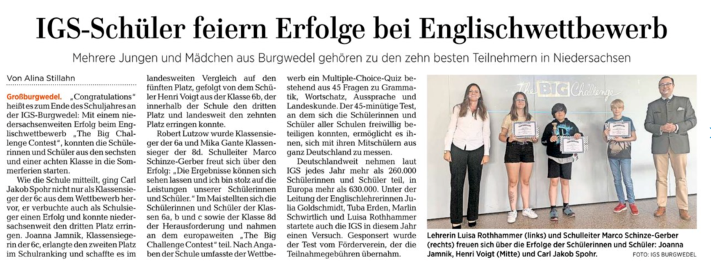 Quelle: Pixabay IGS Burgwedel erfolgreich beim Englischwettbewerb „The Big Challenge“ – HAZ berichtet HAZ - 16.07.22 IGSBurgwedel 19. Juli 2022 Allgemein Weiterlesen Vorheriger Beitrag„Notruf Miriam“ in der Projektwoche – HAZ berichtetNächster BeitragProjektwoche an der IGS Burgwedel – HAZ berichtet Das könnte dir auch gefallen Drei Auszeichnungen in einem Schuljahr – Meerradio berichtet 11. Juni 2025 Auf Entdeckungsreise in Paris 25. September 2023 Preisanpassung Mensaessen 27. Februar 2024