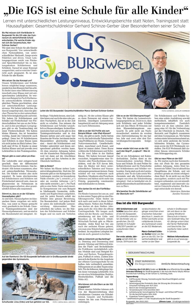„Die IGS ist eine Schule für alle“ – Ein Interview der HAZ mit unserem Schulleiter Dr. Marco Gerhard Schinze-Gerber HAZ - 14.03.23 IGSBurgwedel 15. März 2023 Allgemein Weiterlesen Vorheriger BeitragSpendenaufruf – für die Erdbebenopfer in Syrien und der TürkeiNächster BeitragTag der offenen Tür – AltkreisBlitz und Burgwedel Aktuell berichten Das könnte dir auch gefallen Abschlussfahrt an den Weissenhäuser Strand – Eine Woche voller Spaß und Abenteuer 21. Oktober 2024 ELTERNCAFÉ AN DER IGS BURGWEDEL 25. September 2023 Weihnachtskonzert & Weihnachtsmarkt an der IGS Burgwedel am 19.12.2023 13. Dezember 2023