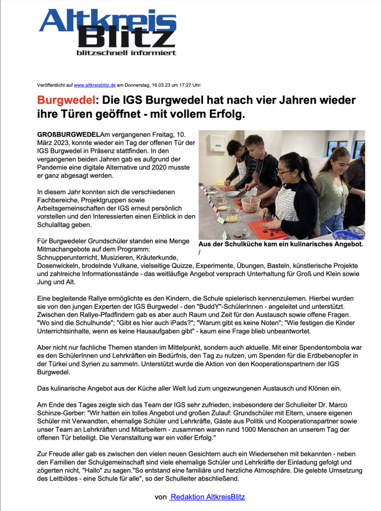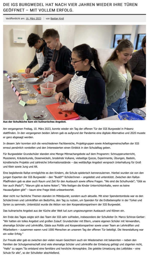 Tag der offenen Tür – AltkreisBlitz und Burgwedel Aktuell berichten AlkreisBlitz - 20.03.23 Bugwedel Aktuell - 20.03.23 IGSBurgwedel 21. März 2023 Allgemein Weiterlesen Vorheriger Beitrag„Die IGS ist eine Schule für alle“ – Ein Interview der HAZ mit unserem Schulleiter Dr. Marco Gerhard Schinze-GerberNächster BeitragIGS in den Medien Das könnte dir auch gefallen IGS nimmt neue Schulküche in Betrieb – HAZ und Burgwedeler Nachrichten berichten 6. Oktober 2021 Ein Schritt in die Eigenverantwortlichkeit – Schülerinnen und Schüler der IGS Burgwedel meistern einen Workshop zum Thema „Finanzen“ 12. November 2021 Are you ready? – Einschulungsfeier unter besonderen Bedingungen 5. September 2020