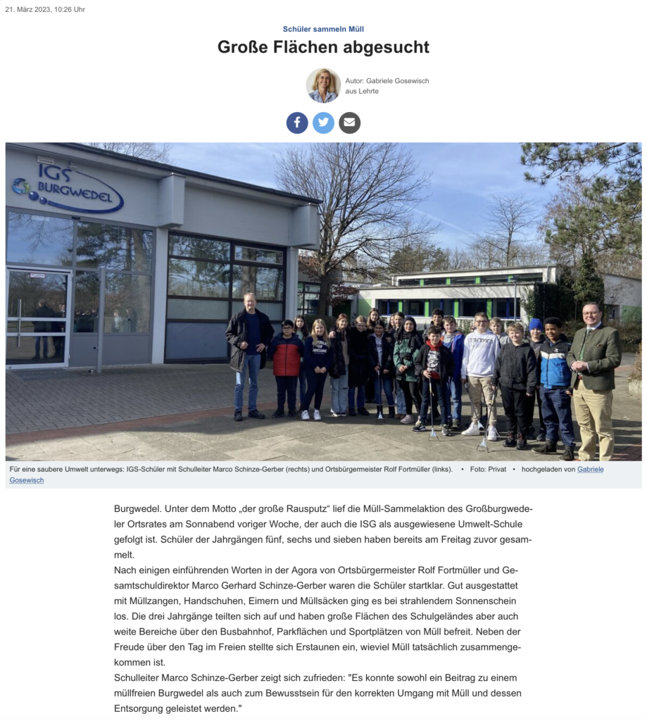 Müllsammelaktion an der IGS Burgwedel – Marktspiegel berichtet Marktspiegel - 21.03.23 IGSBurgwedel 23. März 2023 Allgemein Weiterlesen Vorheriger BeitragIGS in den MedienNächster BeitragFotowettbewerb der IGS Burgwedel 2023 – „Frühling in Burgwedel“ Das könnte dir auch gefallen Kinder pflanzen 1680 Sträucher – HAZ und Marktspiegel berichten 23. November 2022 Schüler der IGS Burgwedel setzen Zeichen gegen Rassismus – AltkreisBlitz berichtet 31. Juli 2024 Presse: „Abschlussklassen der Oberschule werden im Wechselmodell unterrichtet“ 13. Januar 2021
