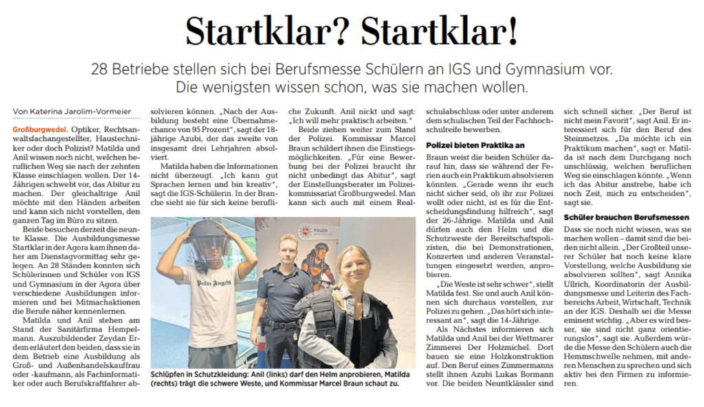 Startklar? Startklar! – HAZ berichtet über die Ausbildungsmesse an der IGS Burgwedel HAZ - 13.09.23 IGSBurgwedel 13. September 2023 Allgemein Weiterlesen Vorheriger BeitragGewinnerklasse 5c -Hoodies für alle Nächster BeitragELTERNCAFÉ AN DER IGS BURGWEDEL Das könnte dir auch gefallen Spendenaufruf – für die Erdbebenopfer in Syrien und der Türkei 4. März 2023 Ministerbriefe – Informationen zu den Weihnachtsferien 10. Dezember 2021 Gewinnerklasse 5c -Hoodies für alle 6. September 2023