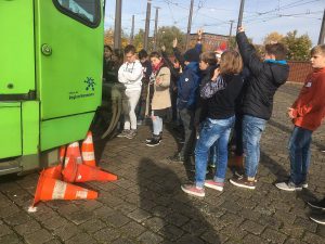 Aber nicht nur in der Theorie wurden die Berufe vorgestellt, sondern man konnte an jeder Station auch selbst ausprobieren: Bagger steuern, verschiedene Nutzfahrzeuge und LKW von innen sehen, Erste Hilfe leisten oder Baustoffe unterscheiden lernen. Auch die brandneue Löschanlage wurde vorgeführt – zum Glück schien die Sonne, denn es wurde dabei recht nass. 🙂 Am Ende spendierte die GP Günter Papenburg AG für alle Schülerinnen und Schüler Bratwurst und Getränke, sodass alle satt und mit vielen neuen Eindrücken zur Schule zurückkehrten.