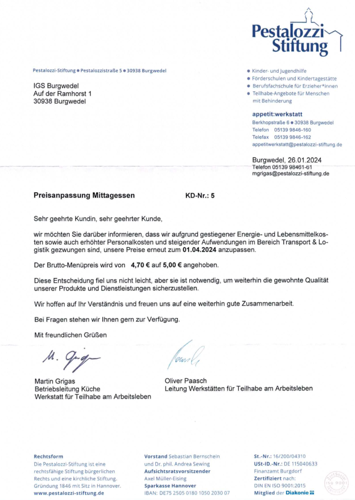 Preisanpassung Mensaessen IGSBurgwedel 27. Februar 2024 Allgemein Weiterlesen Vorheriger BeitragPräsentation Infoabend Jg. 4 vom 14.02.2024Nächster BeitragEntdeckernachmittag an der IGS Burgwedel beim Tag der offenen Tür Das könnte dir auch gefallen Der Schulwald in Burgwedel wächst 16. November 2022 Bereit für die Bühne! Erster öffentlicher Auftritt der Schulband „Taking Back Monday“ 10. September 2024 Goededag! Groeten van IGS Burgwedel uit Nederland! 16. März 2024
