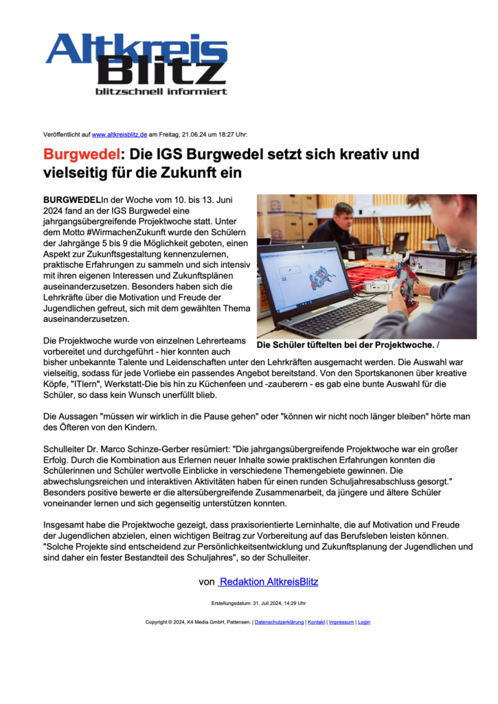 Die IGS Burgwedel setzt sich kreativ und vielseitig für die Zukunft ein AltkreisBlitz - 21.06.24 IGSBurgwedel 31. Juli 2024 Allgemein Weiterlesen Vorheriger BeitragSchüler der IGS Burgwedel setzen Zeichen gegen Rassismus – AltkreisBlitz berichtetNächster BeitragVon der Vorschule in die Grundschule und ab zur weiterführenden Schule – Neues von unseren Schulhunden Das könnte dir auch gefallen Die IGS Burgwedel hat die Wahl … 10. Oktober 2022 Eine Trockenmauer für den Schulwald 8. Oktober 2023 Juniorwahl 2021 – Burgwedeler Nachrichten und AltkreisBlitz berichten 28. September 2021
