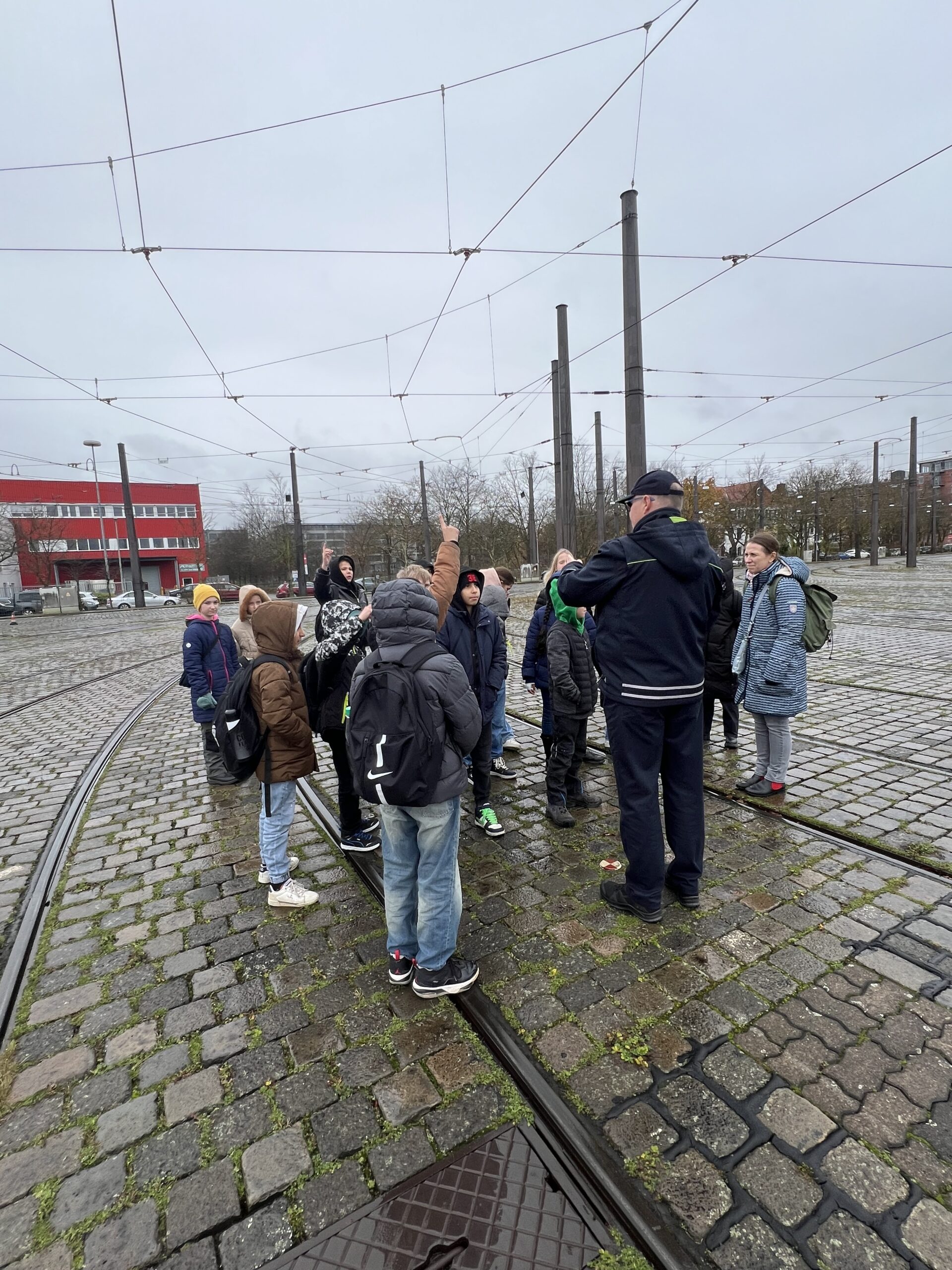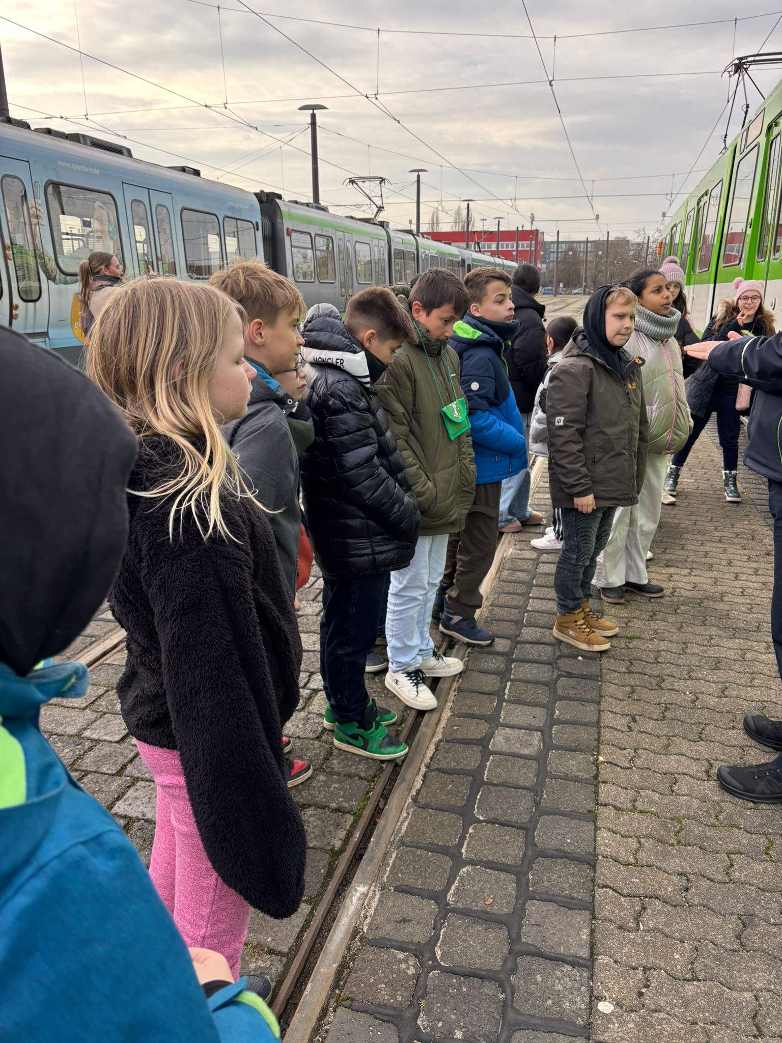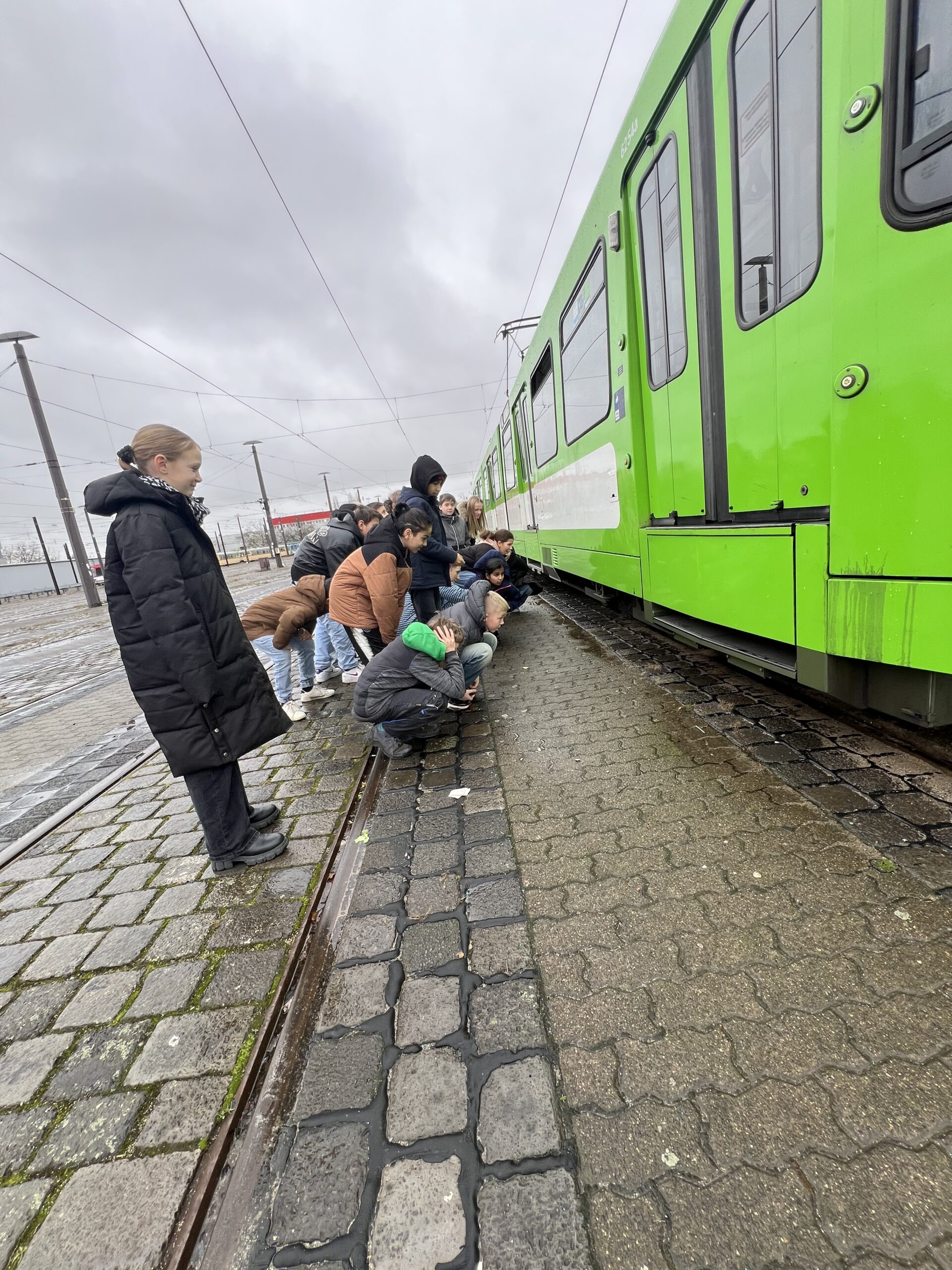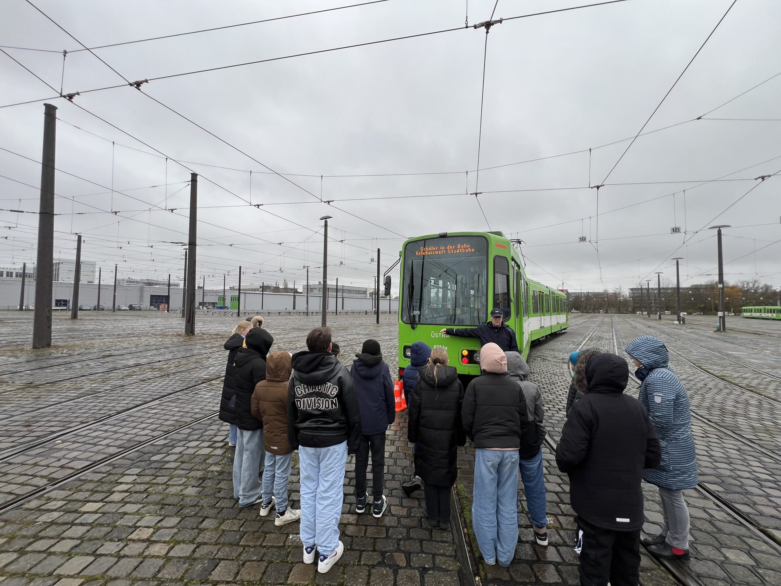 In der ersten Hälfte des Besuches waren die Schülerinnen und Schüler gefordert, ihr theoretisches Vorwissen zur Sicherheit und dem richtigen Verhalten im Ernstfall zu überprüfen. Nach der Präsentation ging es aber auch schon raus auf den Betriebshof, wo nicht nur der Bremstest in einer eigens dafür vorbereiten Bahn für große Augen sorgte, sondern auch die Waschanlage für Straßenbahnen.