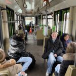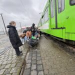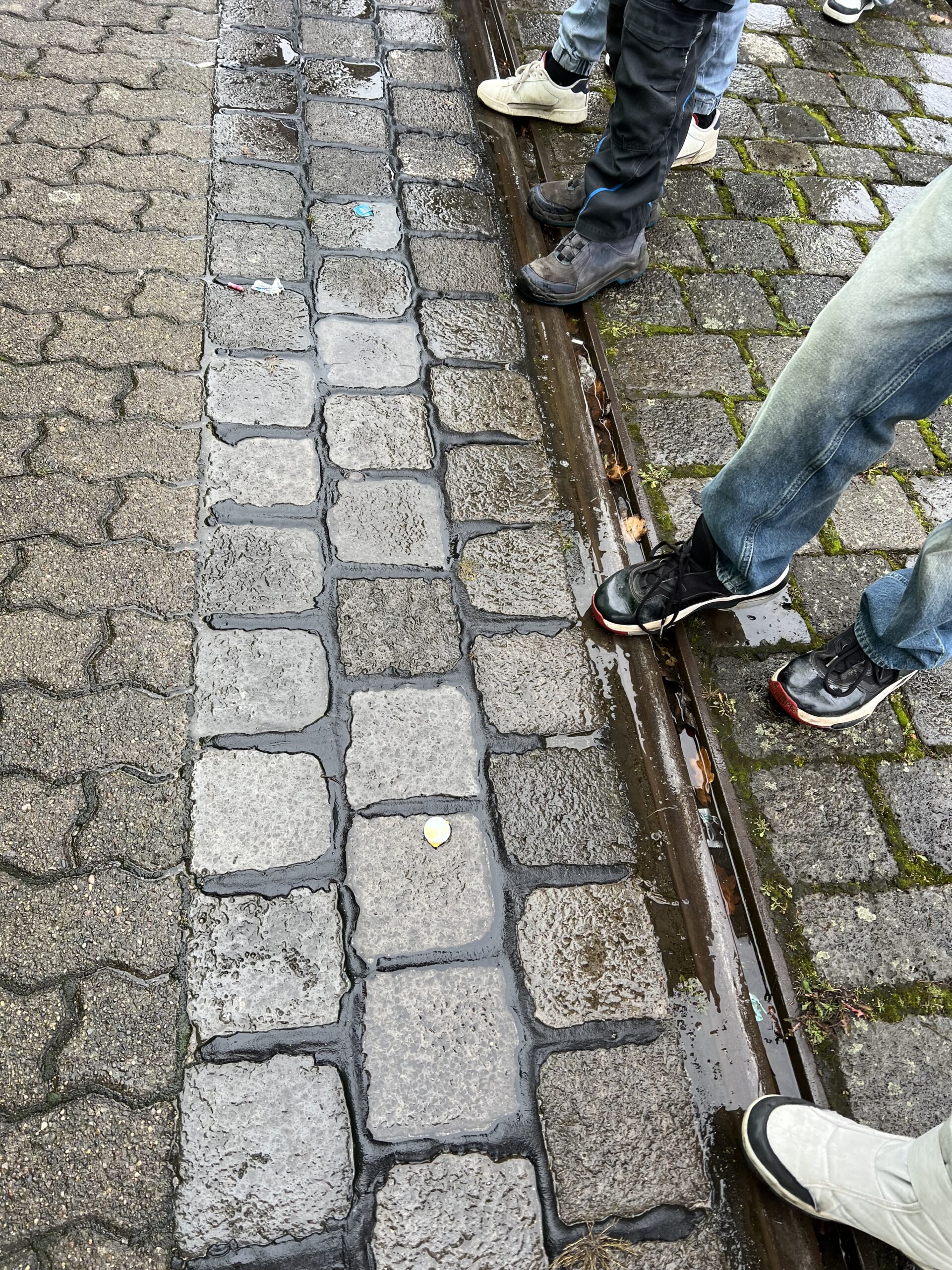 Die Schülerinnen und Schüler lernten, dass man neben den Schienen einen Sicherheitsraum von mindestens drei Pflastersteinen einhalten muss, damit man im Ernstfall nicht umgefahren wird. Denn das Fahrzeug schwingt aus, das bedeutet, dass der erste Wagen in der Kurve sehr viel mehr über die Schienen herausragen kann und man daher einen Sicherheitsbereich braucht.
