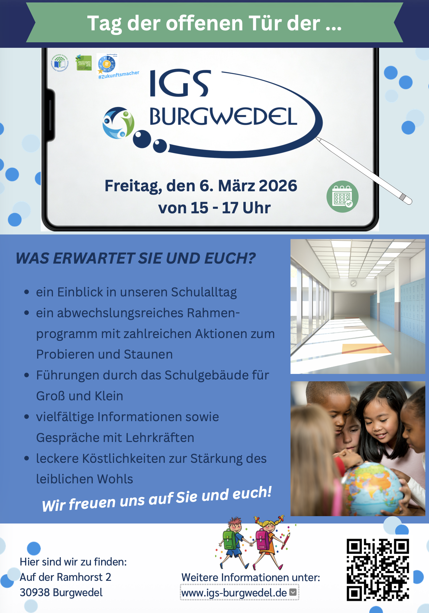 Es ist wieder soweit, unser alljährlicher Tag der offenen Tür findet in Kürze statt. Am 06. März diesmal von 15 – 17 Uhr öffnen wir unsere Schule allen Besucherinnen und Besuchern, die schon immer mal wissen wollten, wie unsere IGS von innen aussieht. Sollten Sie überlegen, ihr Kind bei uns anzumelden, kommen Sie gern vorbei, um uns besser kennenzulernen. Natürlich sind aber auch wie immer alle anderen Interessierten herzlich eingeladen vorbeizuschauen und an den sehr vielen und liebevollen Aktionen, die unser Kollegium bereits fleißig plant, teilzunehmen.