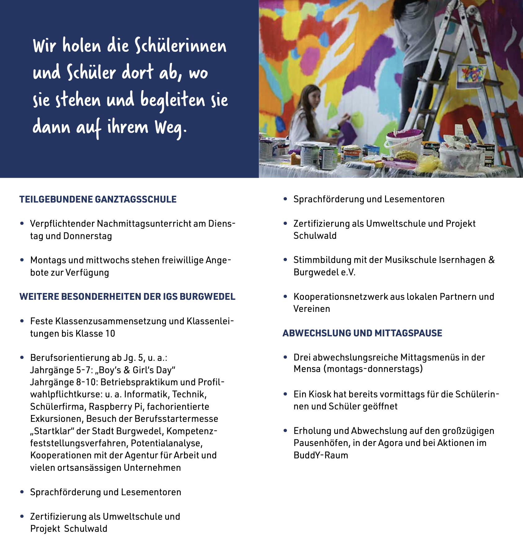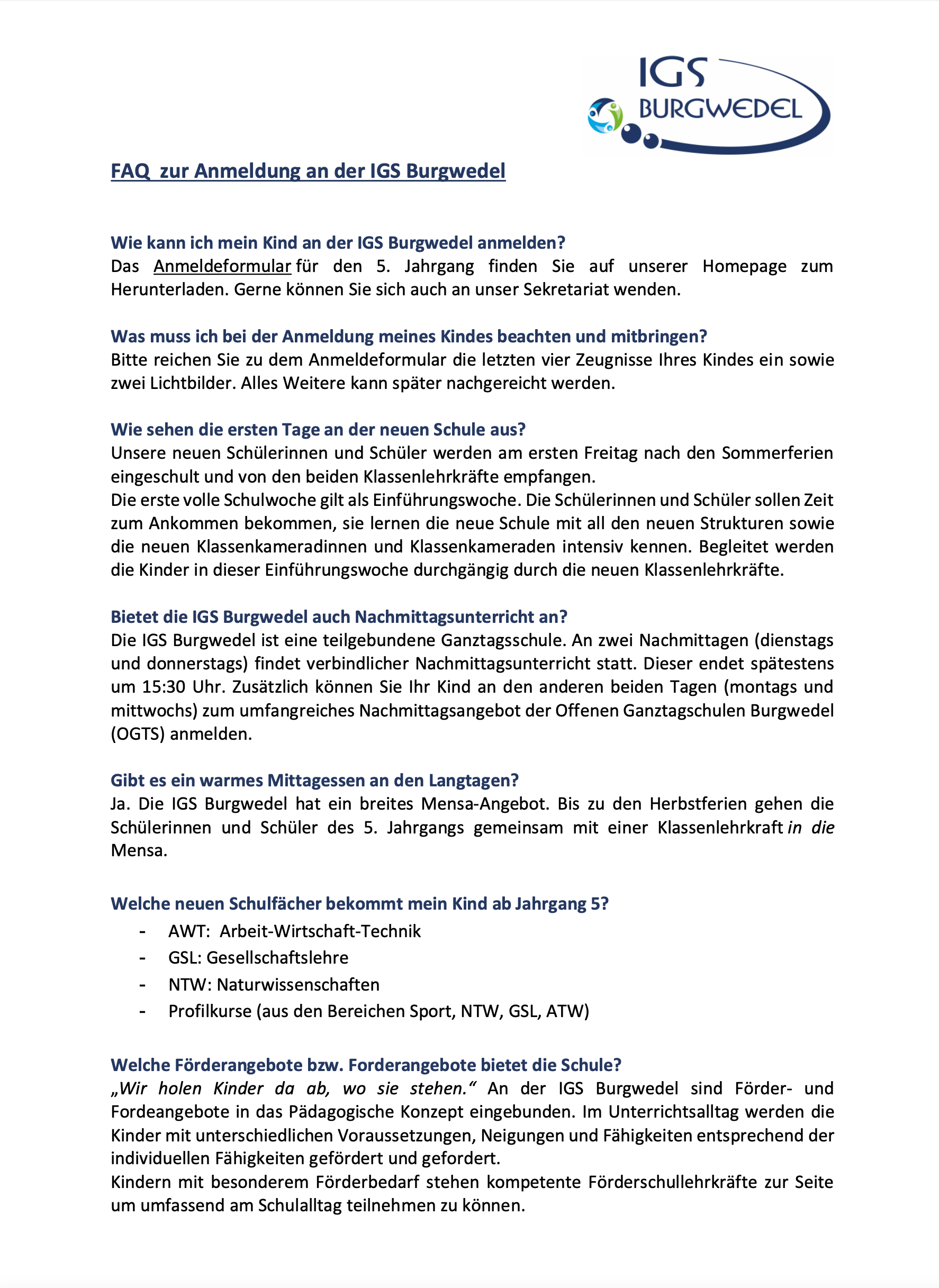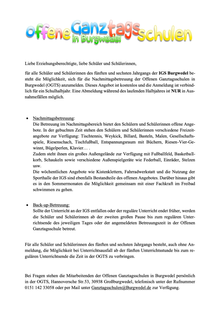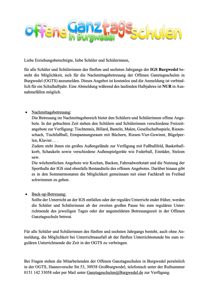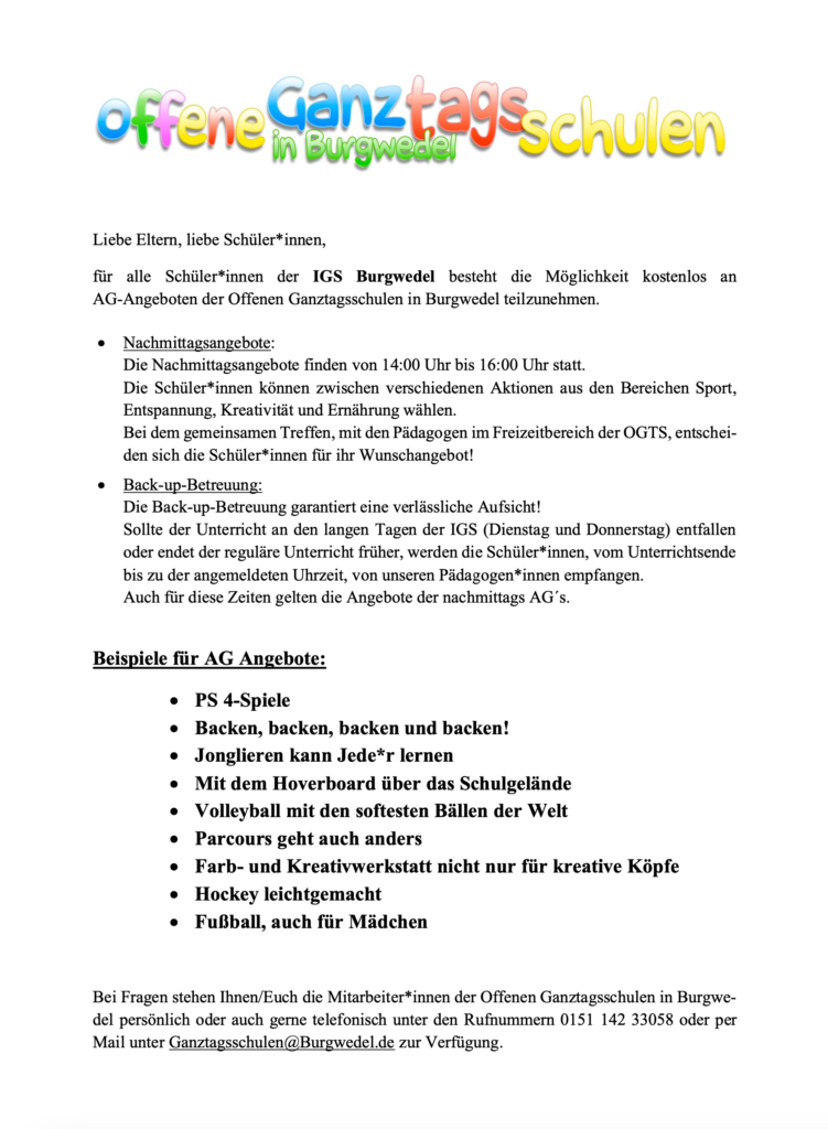 Allgemeine Fragen zur IGS können Sie gerne jederzeit unter info@igs-burgwedel.de stellen. Für individuelle Fragen und Beratung stehen wir Ihnen telefonisch unter: 05139 / 80674 -0 zur Verfügung.