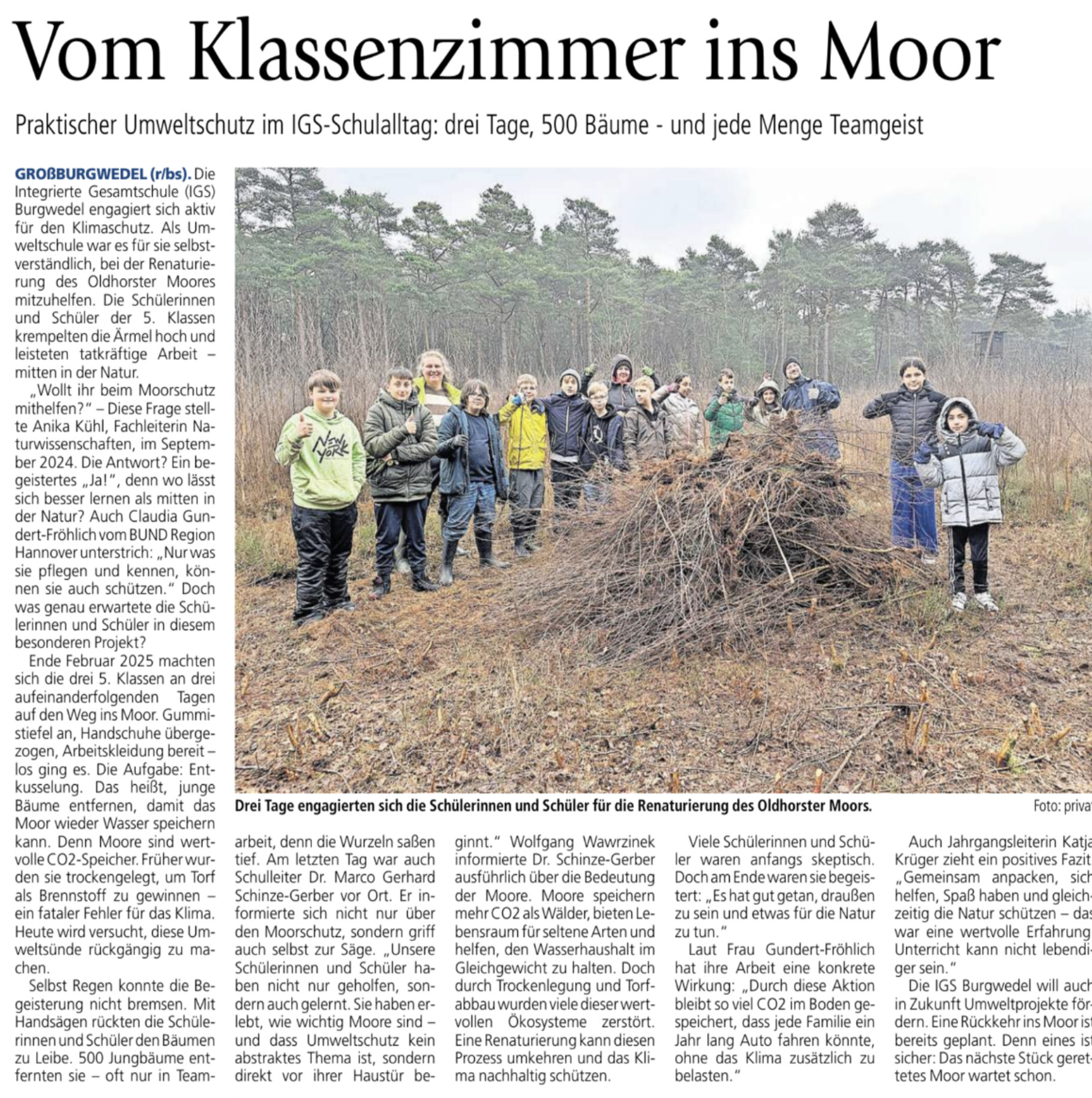 Burgwedel, 3. März 2025 – Die Integrierte Gesamtschule (IGS) Burgwedel engagiert sich aktiv für den Klimaschutz. Als Umweltschule war es für sie selbstverständlich, bei der Renaturierung des Oldhorster Moores mitzuhelfen. Schülerinnen und Schüler der 5. Klassen krempelten die Ärmel hoch und leisteten tatkräftige Arbeit – mitten in der Natur.