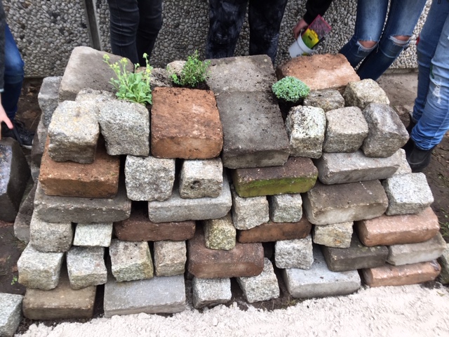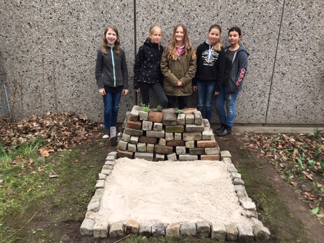 Die Klasse 6a baute aus alten herumliegenden Pflastersteinen eine Trockenmauer.  Trockenmauern stellen ein wichtiges Domizil für diverse Insekten, kleine Säugetiere und die sehr selten gewordenen Zauneidechsen dar. Die Tiere können sich darin verstecken, ausruhen und nisten. Wichtig dabei war es, einen möglichst sonnigen Platz zu finden und viele Ritzen und Spalte einzubauen. In die oberste Etage wurden einige sonnenhungrige Pflänzchen gepflanzt. Trockenmauern sind leider rar geworden, da sie in Wohngebieten von Betonwänden und festgemauerten Einfriedungen abgelöst wurden. Mit den alten Mauern verschwanden leider auch ihre Bewohner.