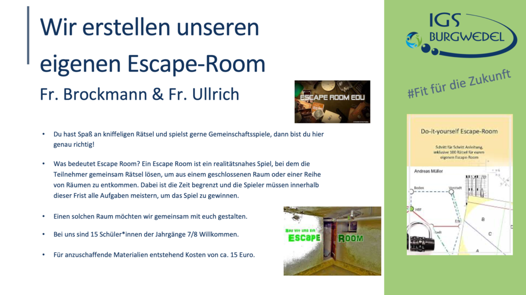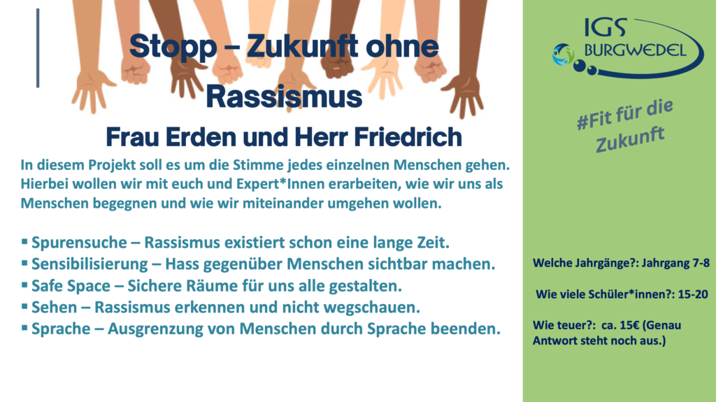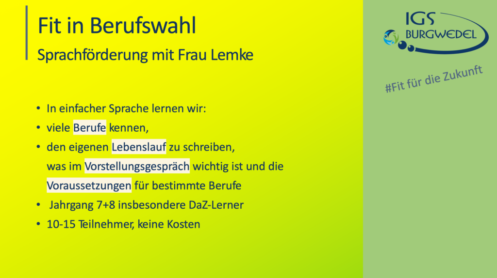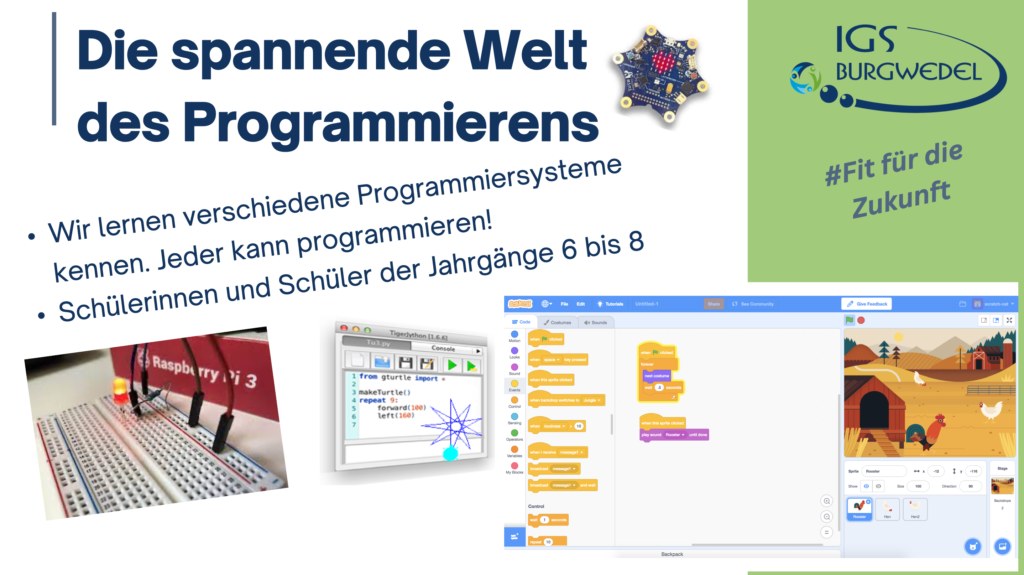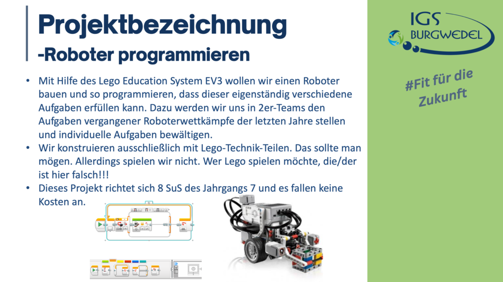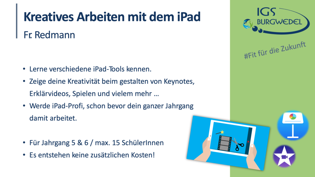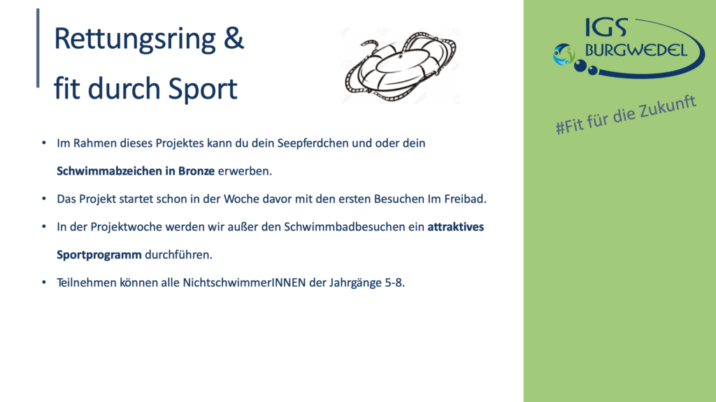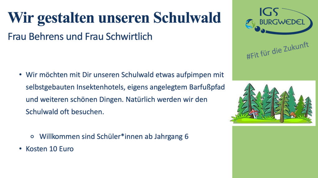 Vom 10.06. – 13.06.2024 findet an der IGS Burgwedel die diesjährige Projektwoche unter dem Motto #Fit für die Zukunft statt. Die Jahrgänge 5-8 können aus einer breiten Auswahl an Angeboten wählen. Alle Angebote finden Sie und ihr auf dieser Seite.