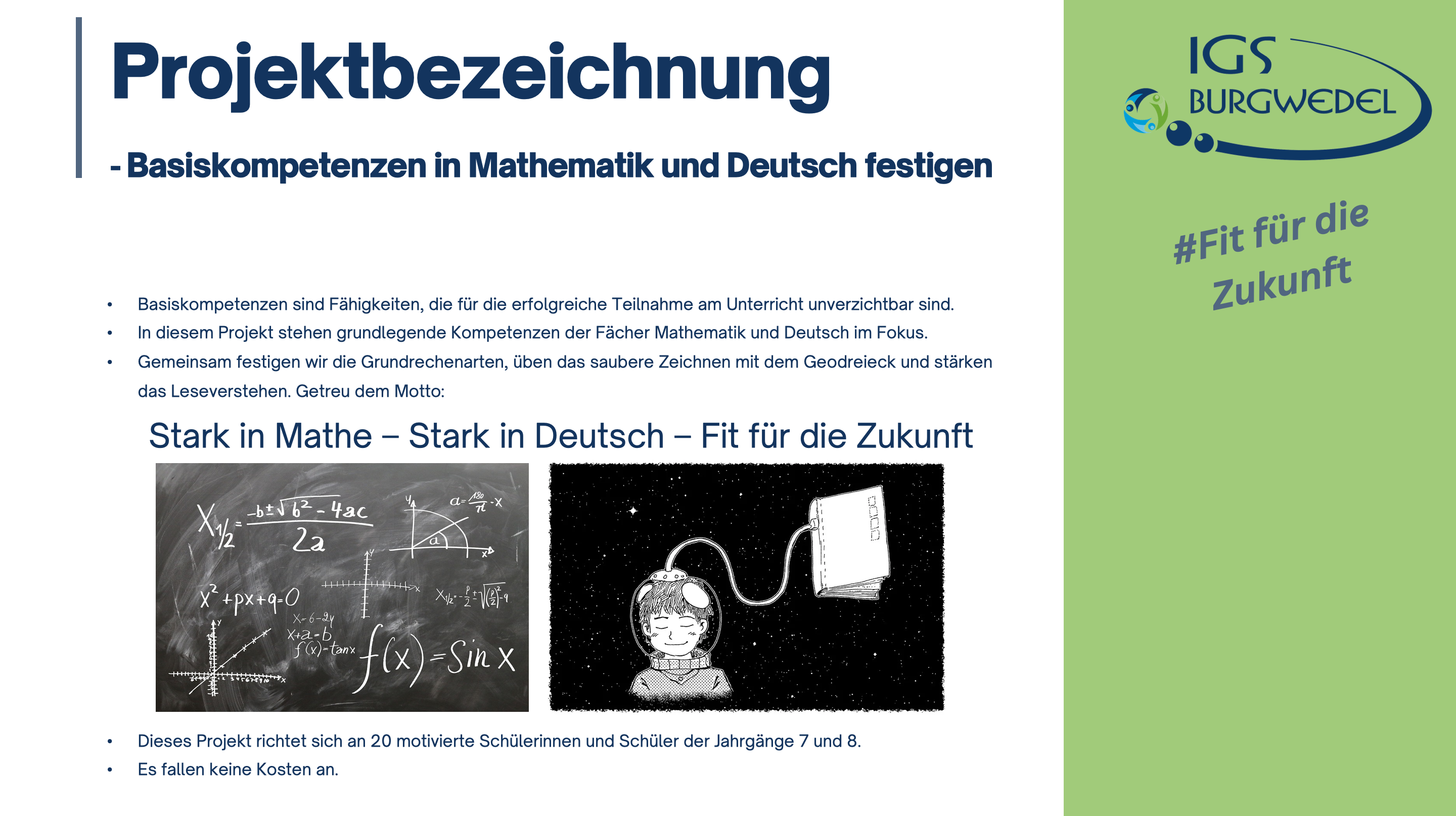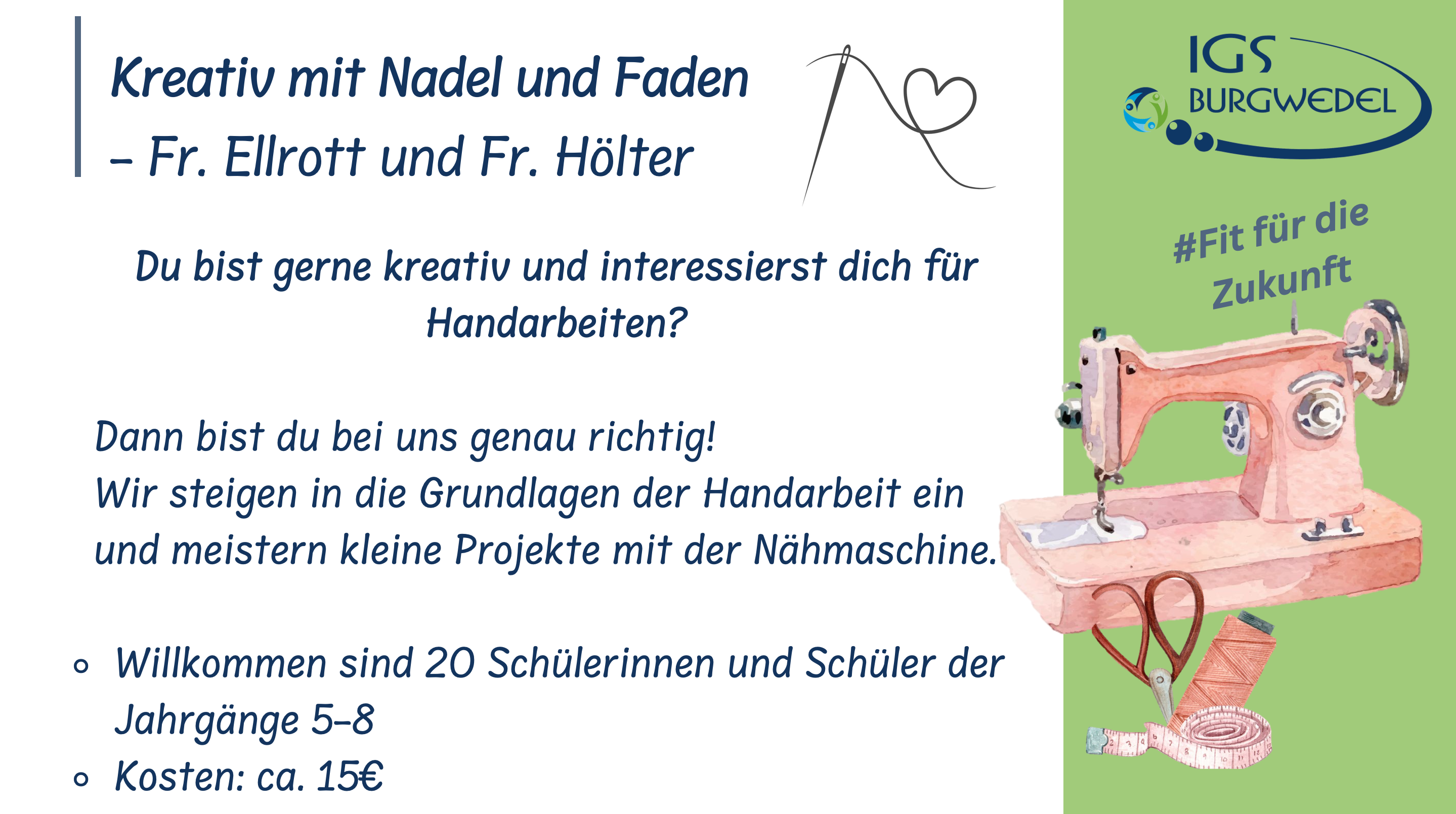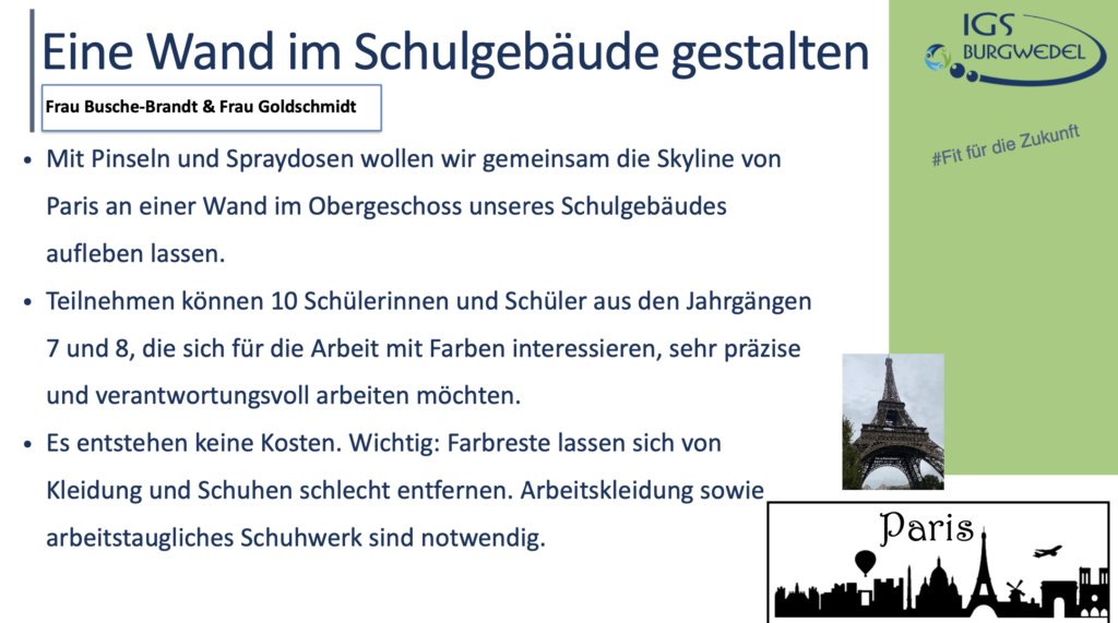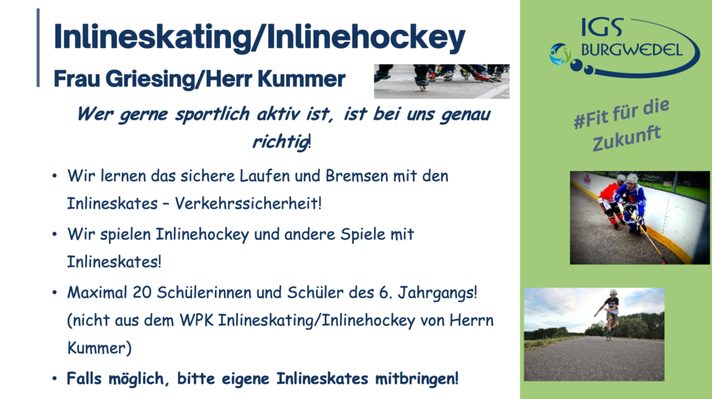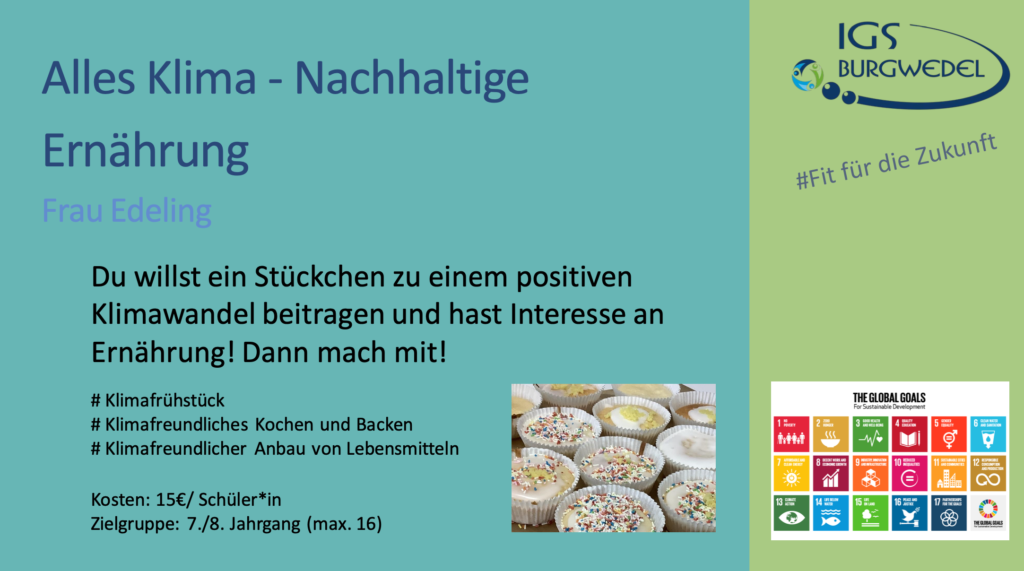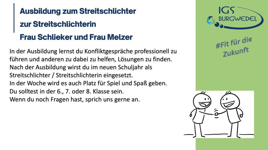 Vom 10.06. – 13.06.2024 findet an der IGS Burgwedel die diesjährige Projektwoche unter dem Motto #Fit für die Zukunft statt. Die Jahrgänge 5-8 können aus einer breiten Auswahl an Angeboten wählen. Alle Angebote finden Sie und ihr auf dieser Seite.