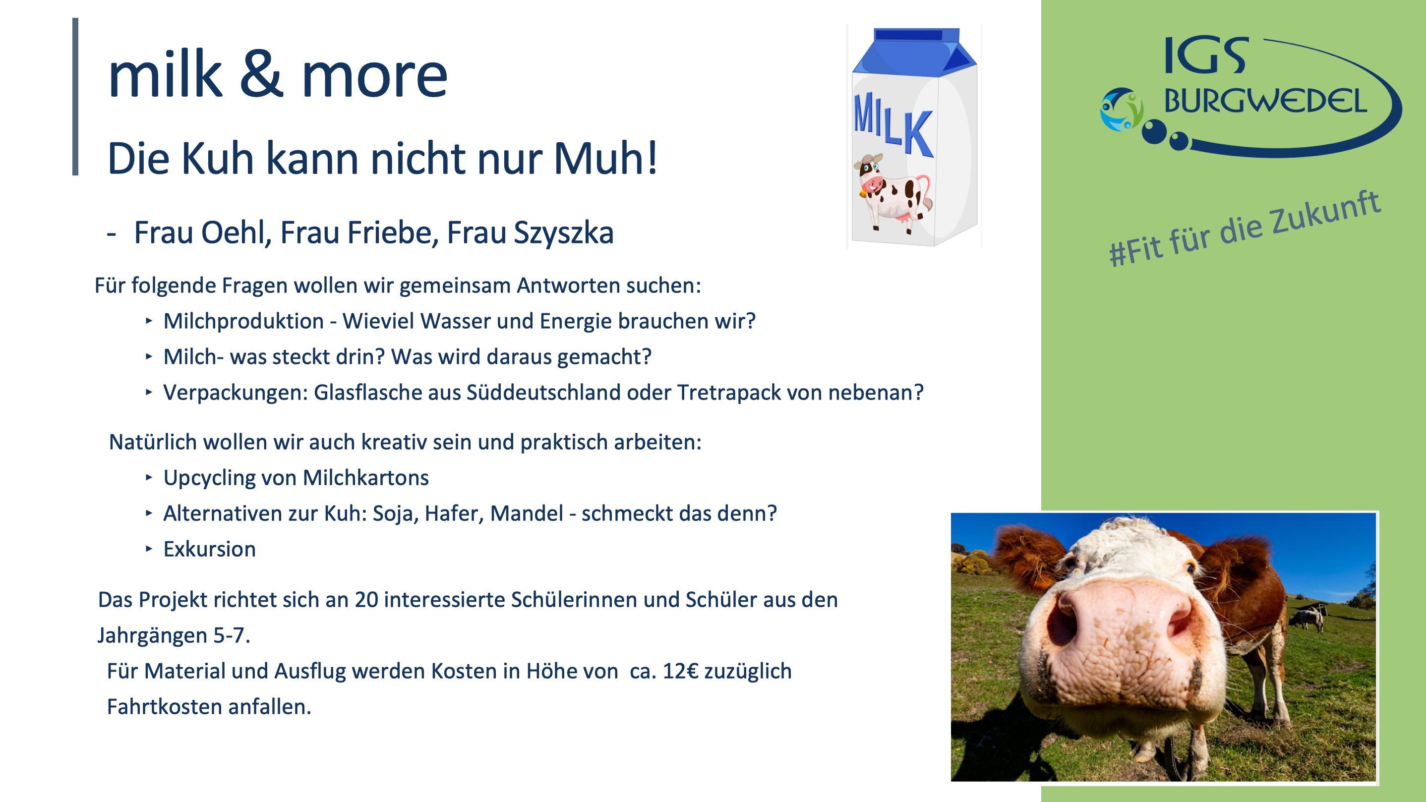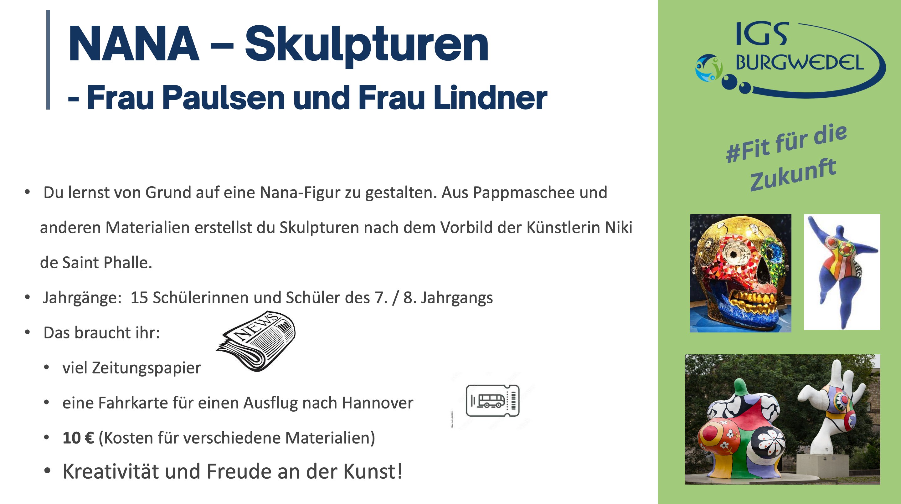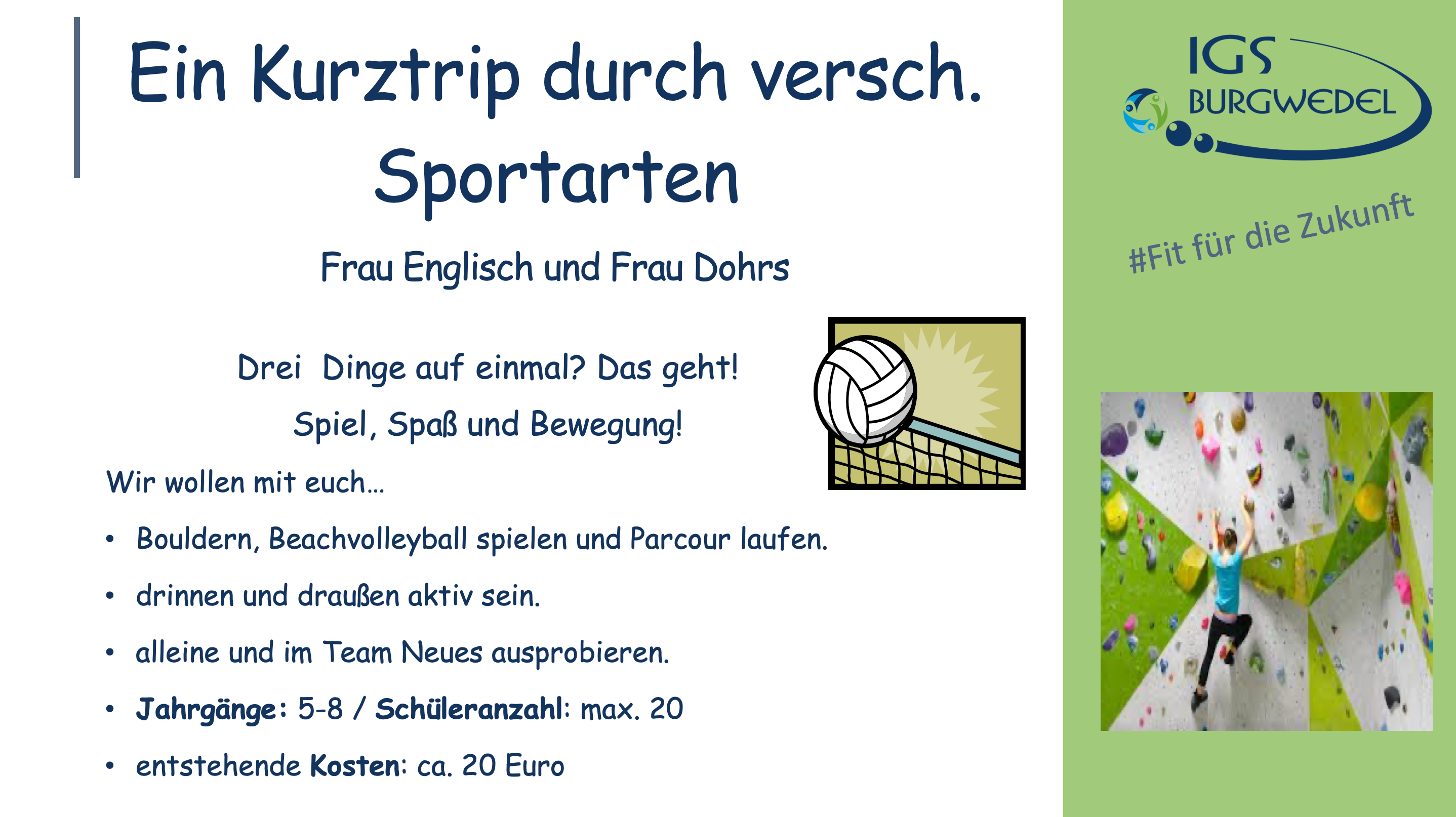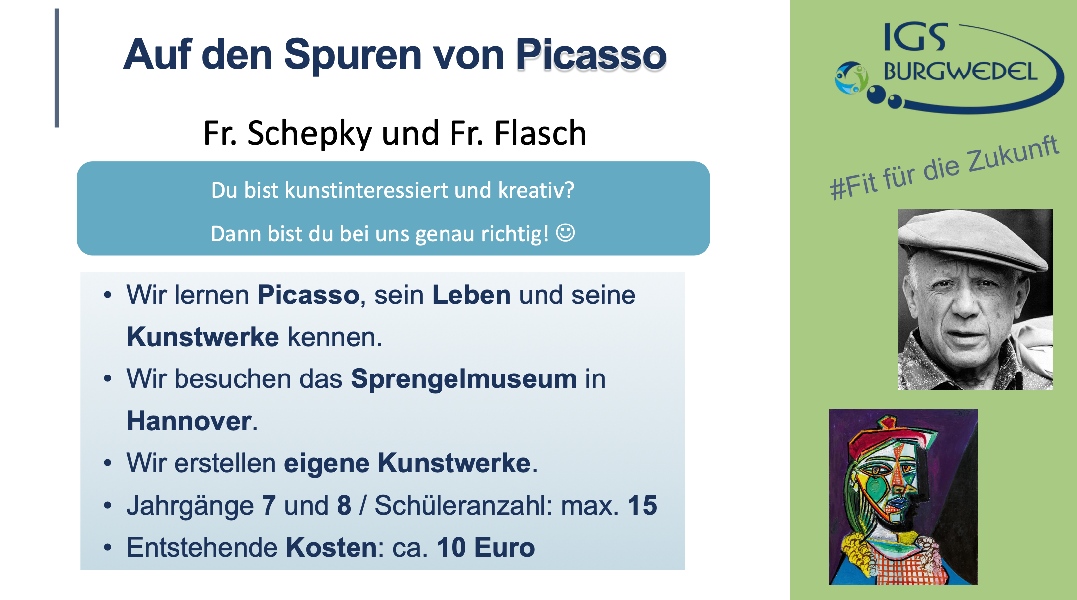 Vom 10.06. – 13.06.2024 findet an der IGS Burgwedel die diesjährige Projektwoche unter dem Motto #Fit für die Zukunft statt. Die Jahrgänge 5-8 können aus einer breiten Auswahl an Angeboten wählen. Alle Angebote finden Sie und ihr auf dieser Seite.